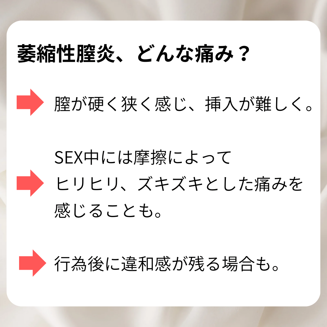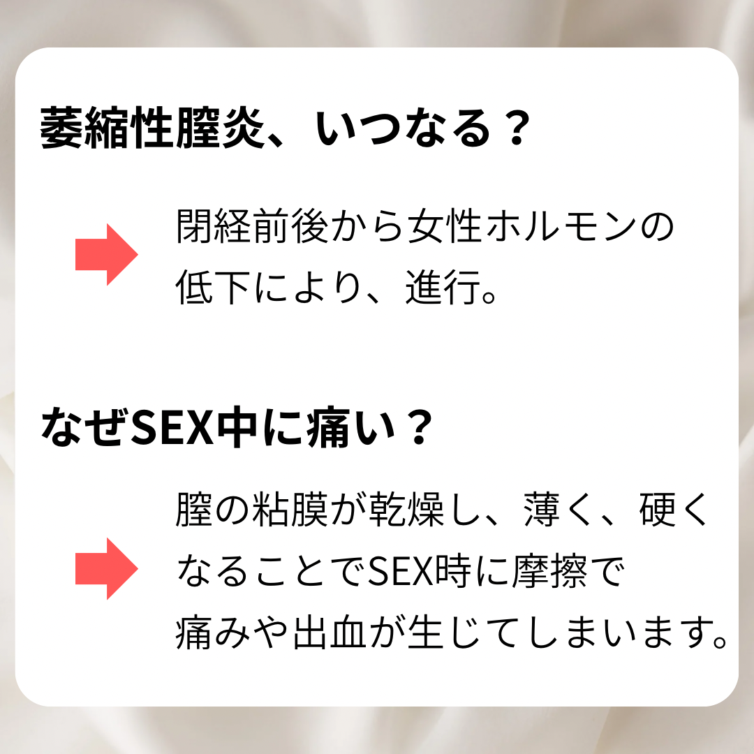 膣の粘膜が乾燥し、薄く、硬くなることで性交時の摩擦によって痛みや出血が生じてしまいます。